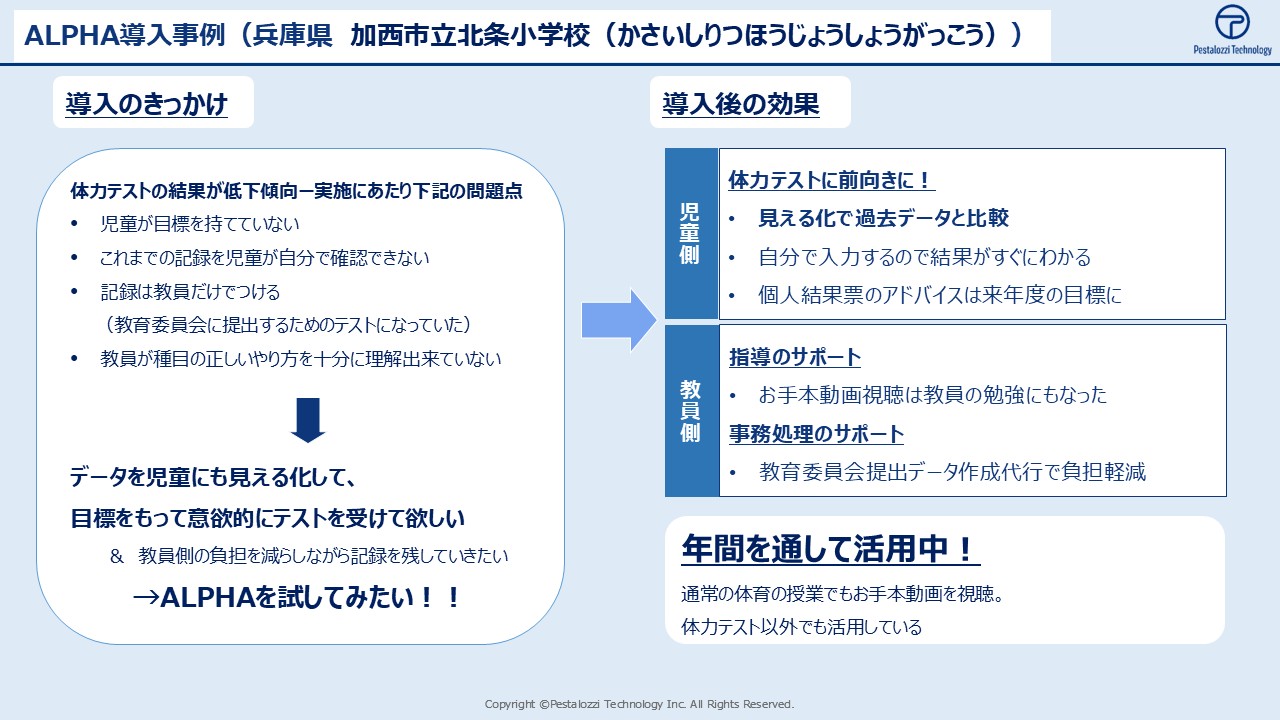 ALPHAのことはPestalozzi Technologyからのダイレクトメールで知り、近隣の小学校でも導入していることもあって気になっていました。デモ版で試したときに、サービスも充実しており、課題だったデータの管理や教員の負担などが解決されると思いました。その後、管理職の教員に相談し、PTAの役員の方々にプレゼンをして賛同をいただき導入に至りました。